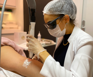 Tecnologia para eliminar vasinhos com precisão. Sessões curtas, com resfriador de pele para mais conforto.
